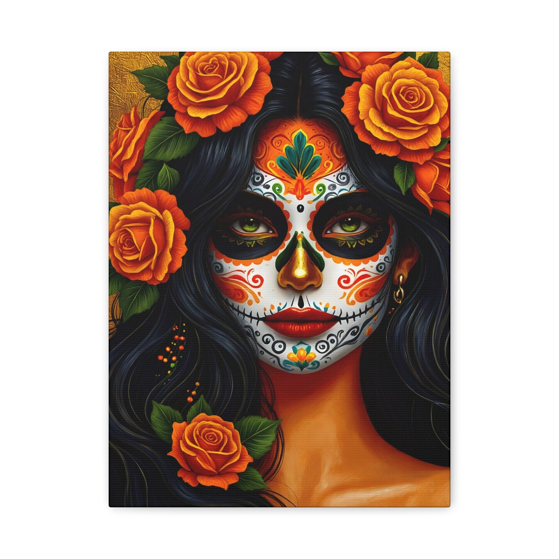 On the canvas of the night, her face is an altar of life and death, painted with the delicacy of ancestral traditions. Orange flowers, like unquenchable flames, crown her dark hair and frame her eyes, which hold secrets of eternity. Each stroke on her skin is a verse, a whisper celebrating memory and the beauty that transcends time. This work is a vibrant tribute to the strength and mystery that dwell in the human soul.