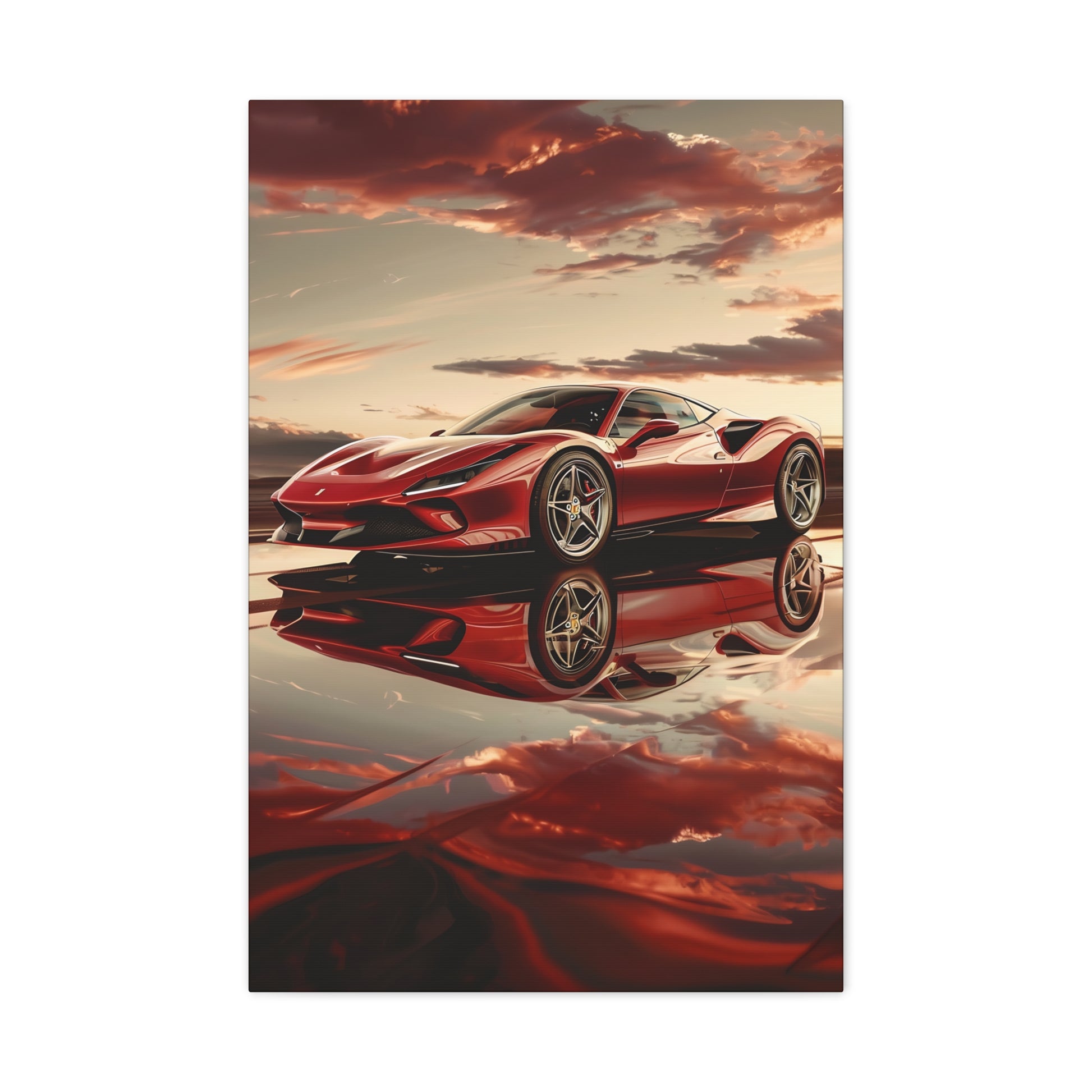 A ruby supercar rests atop a liquid mirror that reflects a sky set ablaze. Its lines are sculpture in motion, the wheels like forged stars, and the sheen whispers exclusivity: power, elegance, and the promise of speed. An invitation to pursue your dreams with luxury and resolve.