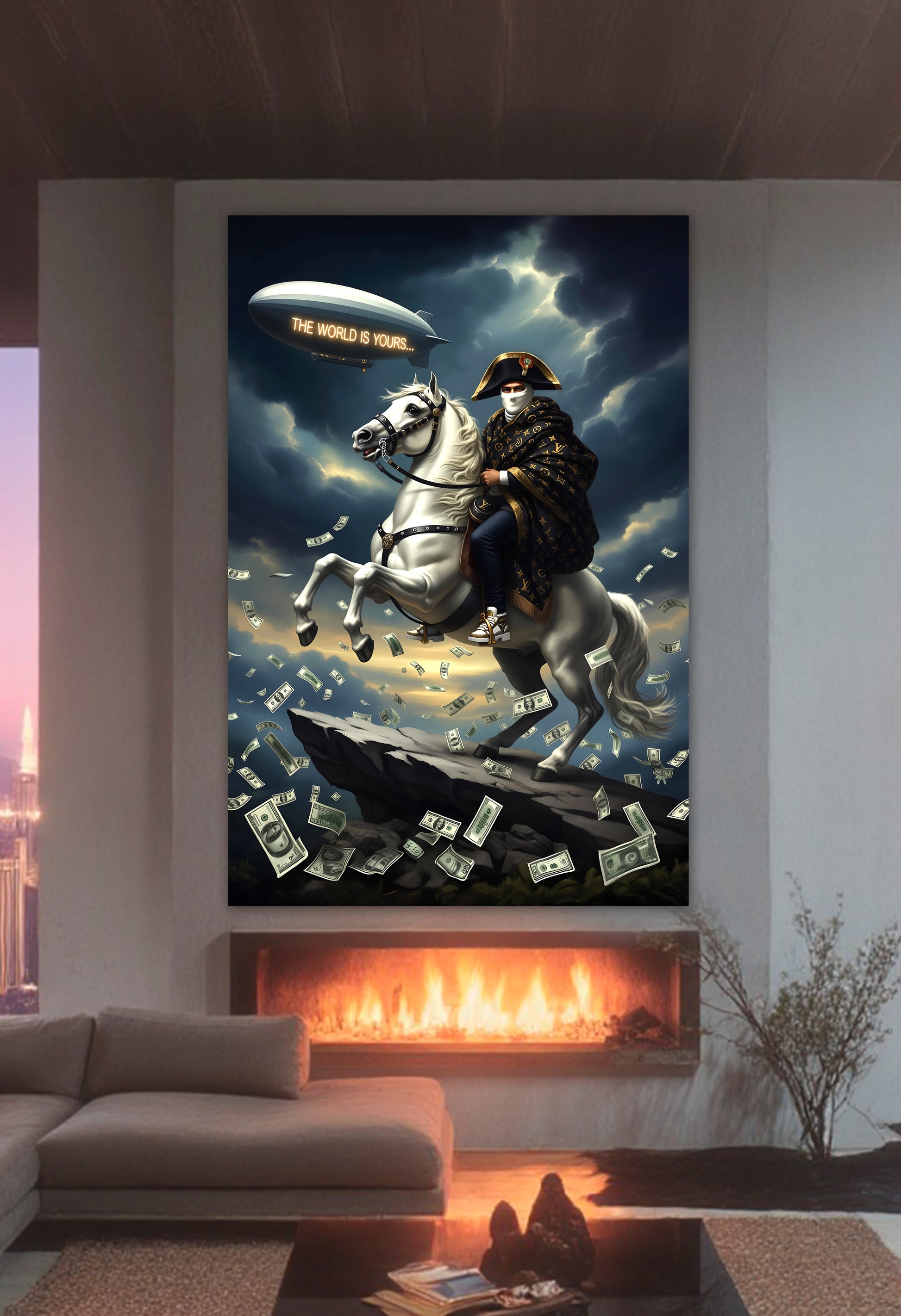At the summit of a tempestuous era, a rider rises atop a white horse, untouched by the chaos around him. Cloaked in power and mystery, he moves resolutely from a cliff toward the horizon as bills fall like promises and an airship proclaims that the world is within reach. He embodies the one who defies fate with boldness, turns ambition into action, and reminds us that greatness is born when we dare to claim our place. May his figure inspire you to mount your fears, take the reins, and forge your own empire.