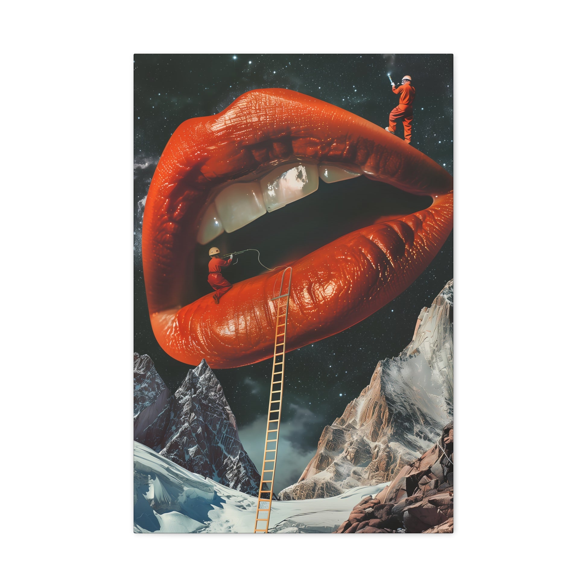 At the summit of silence, guardians in orange climb toward a cosmic lip that opens a threshold. A golden ladder links the snow to a kiss‑portal; the teeth are beacons of constellations and the mouth holds an abyss of secrets and spells. Each step whispers a charm that unfolds galaxies.
