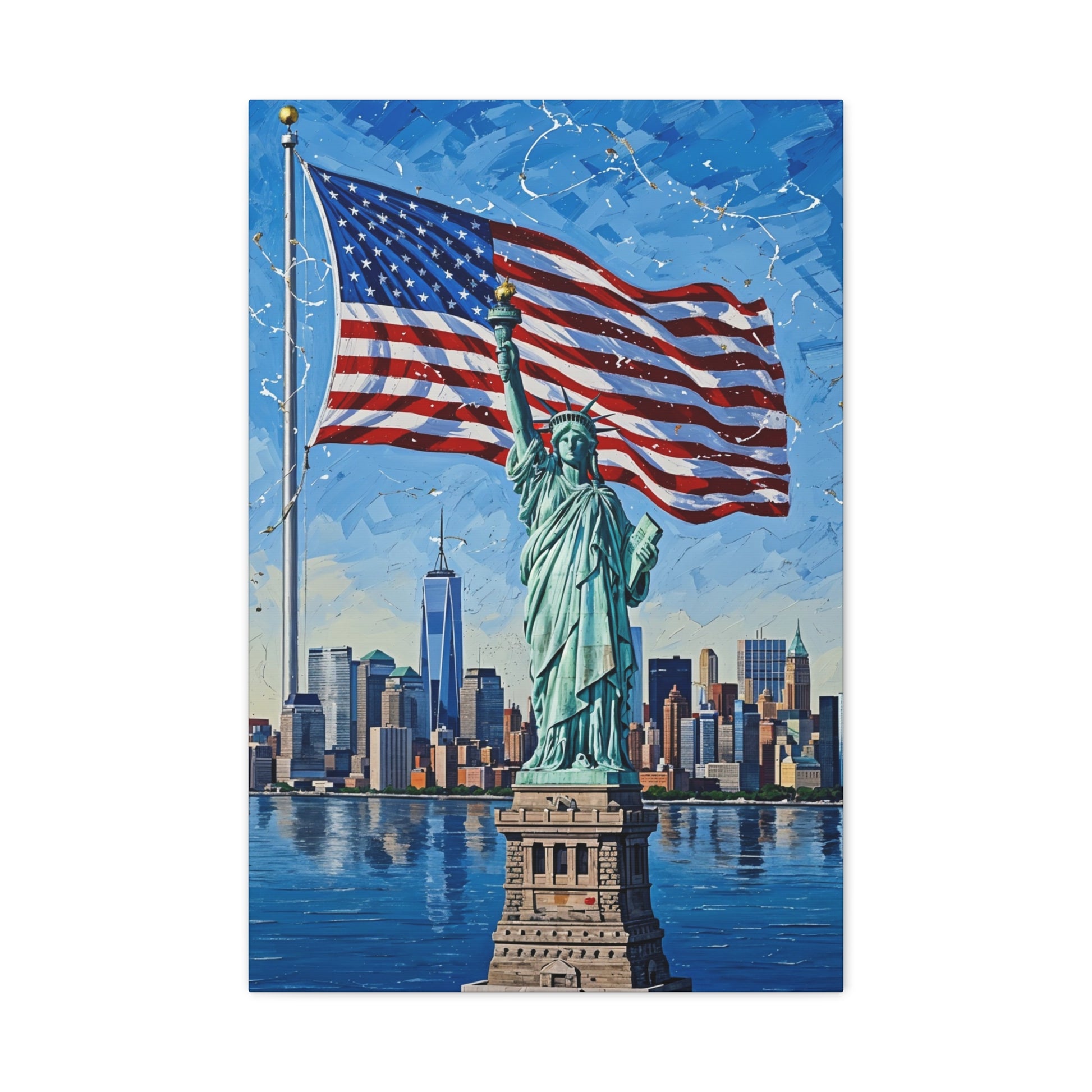 The statue raises its flame like an oath that rends the sky; the flag beats in red and white above the city that never sleeps. Reflections of hope dance on the water as skyscrapers guard ancient dreams. Come, stand beneath that light and let liberty name you.