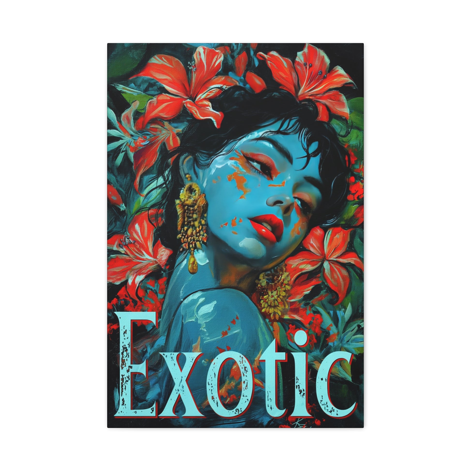 She appears like a painted myth: blue skin of liquid night, strokes of fire scattered across her cheeks and shoulders. Hibiscus set ablaze crown her hair; earrings like relics holding ancient songs. To gaze at her is to smell distant shores and long to touch a color not of this world.