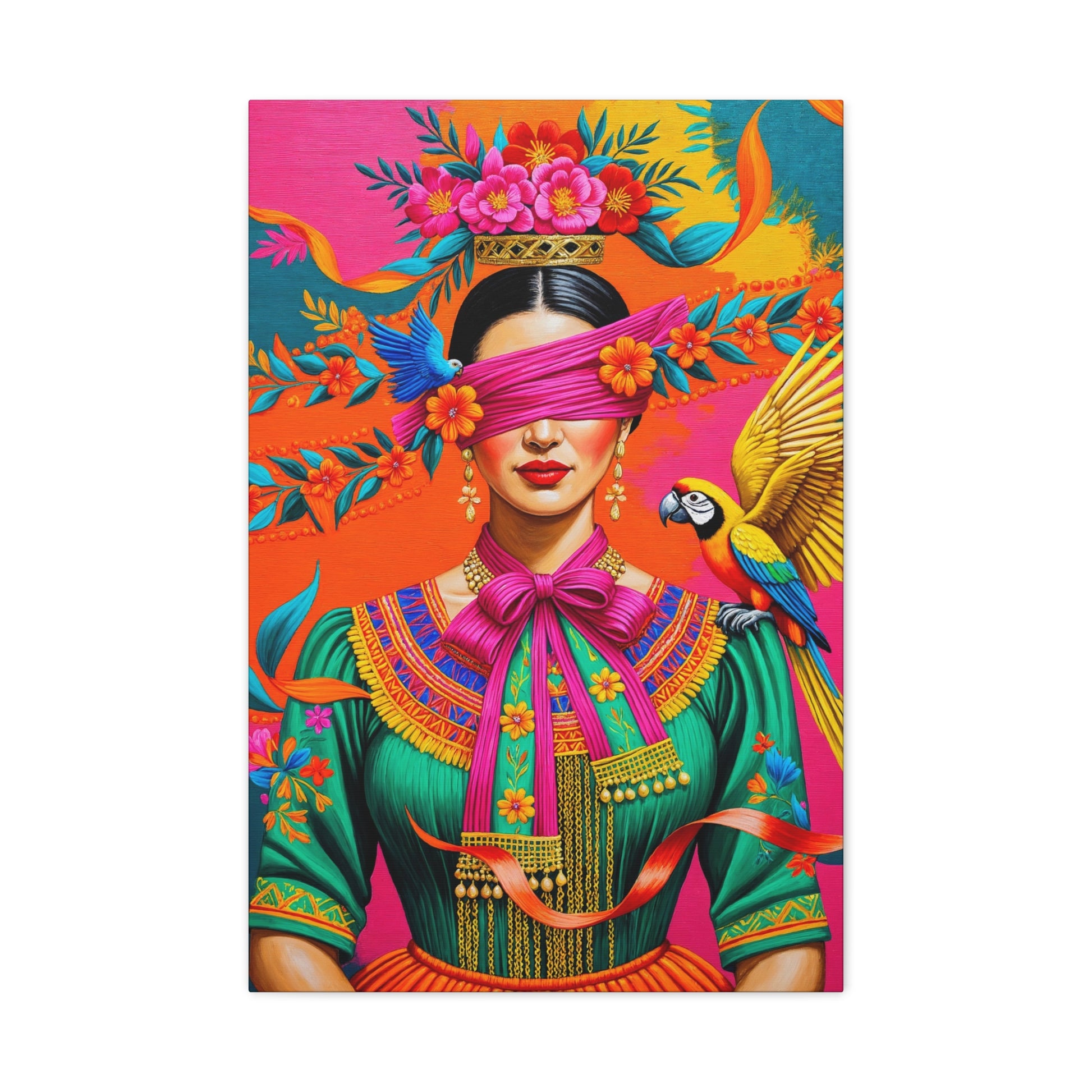 Crowned with flowers and vivid color, she moves forward blindfolded yet with her heart awake. The blindfold becomes trust, the parrot a steadfast companion, and every petal and fold urges her upward. A vibrant call to trust your inner compass, take the leap, and soar toward your own greatness.